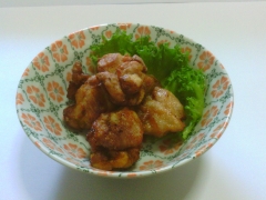 @ジッパー付のビニール袋に一口大にきった鶏肉、しょうゆ、酒、みりん、にんにく、しょうが汁を入れて、